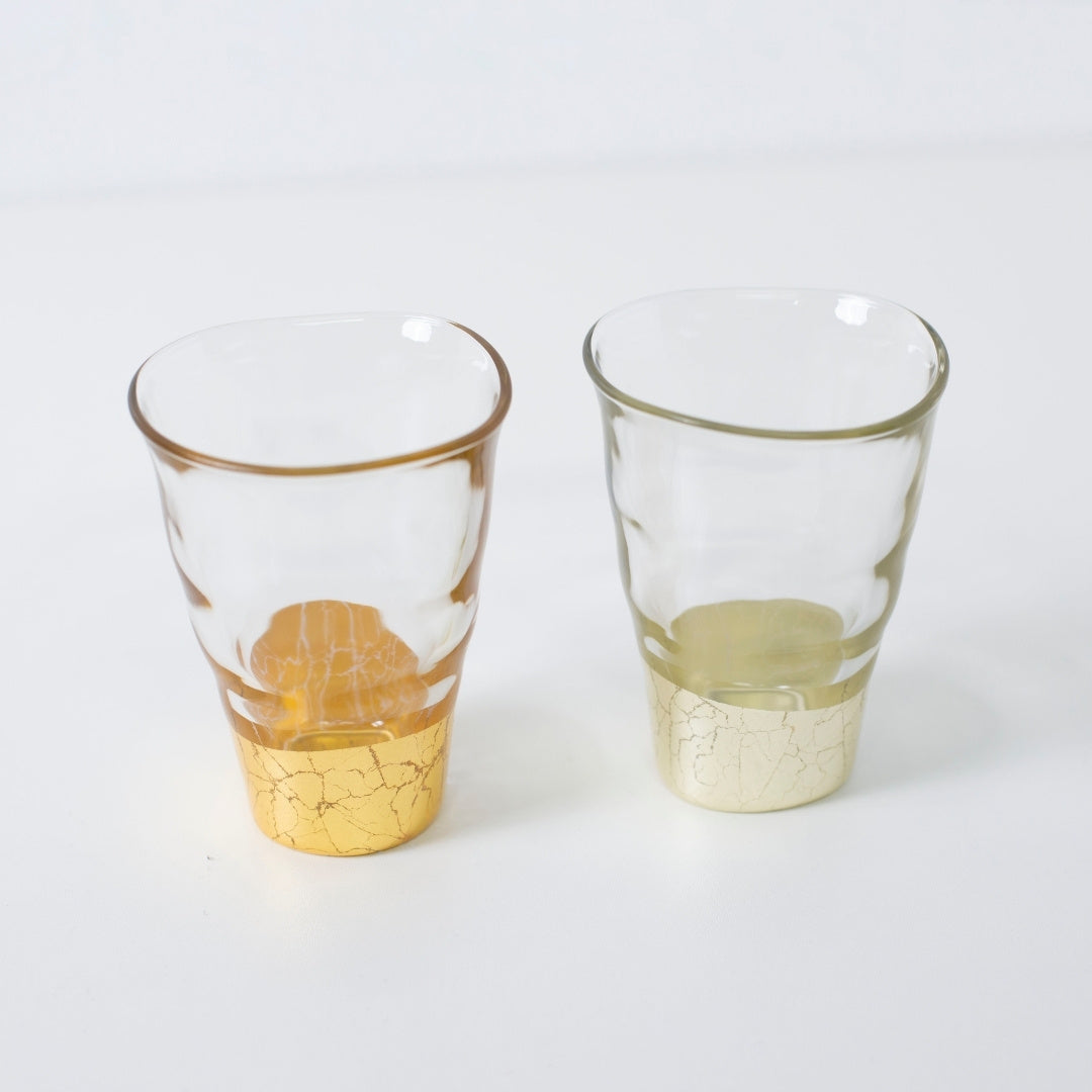 Hakuichi's set of two small sake glasses (11cm H) boasts Kanazawa gold leaf. Hand-applied crackled patterns radiate a quiet glow, reflecting 450 years of Japanese tradition.