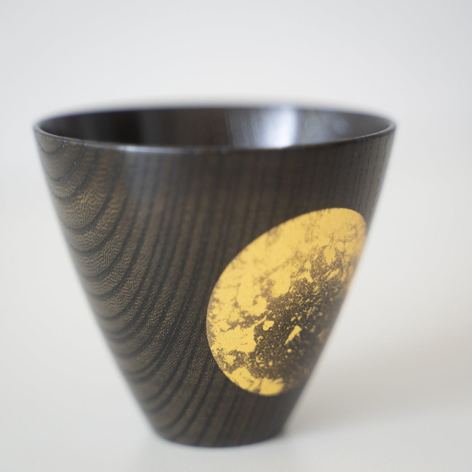 Each "Hazy Moon" cup is uniquely beautiful. Handcrafted, the gold leaf moon enhances natural wood grain, offering a timeless piece of refined Japanese taste.